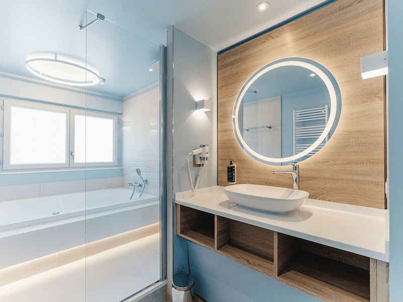 - חדר רחצה מקלחת, כיור, מייבש שיער ושירותים.